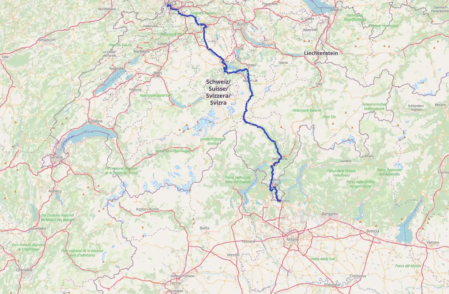 Die Nord-Süd-Route führt durch die grossen Schweizer Landschaftsräume Jura, Mittelland, Zentralschweiz und über die Alpen in die Südschweiz. Sie folgt dabei zahlreichen historisch und kulturell bedeutenden Verkehrswegen und Ortschaften.